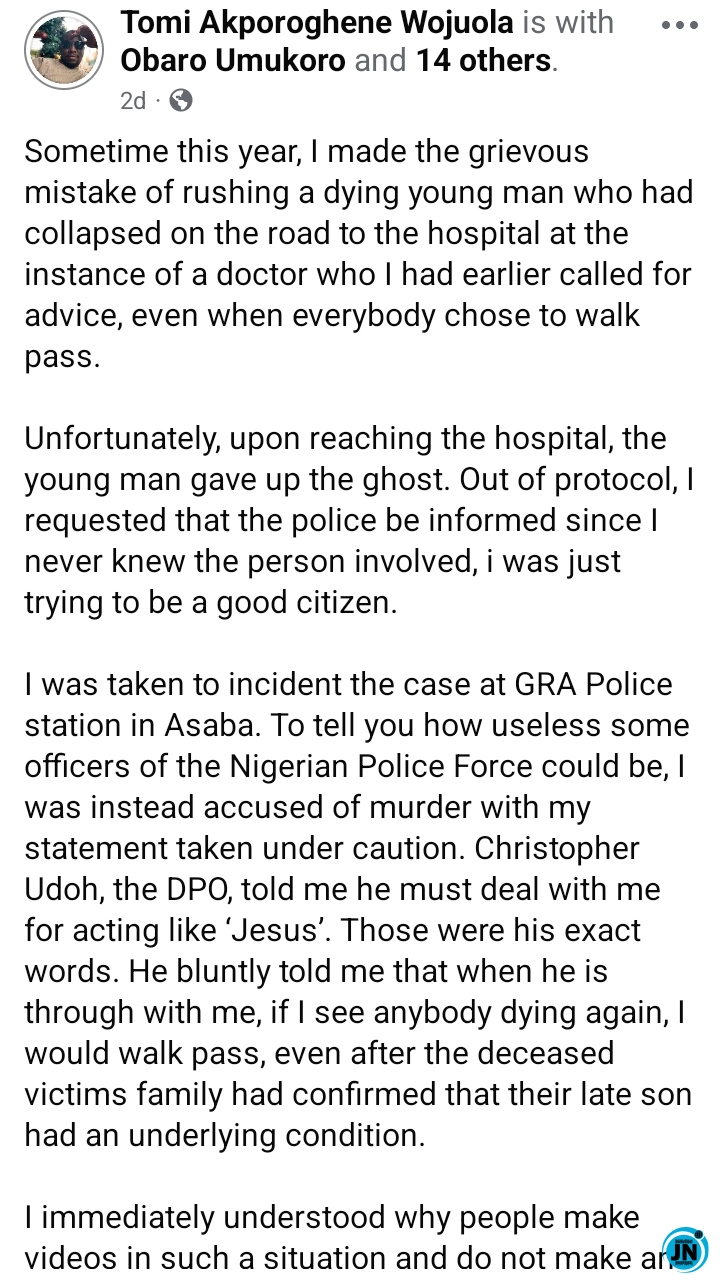 A Nigerian man, identified as Tomi Akporoghene Wojuola, has recounted a harrowing and emotional encounter with officers of the Nigerian Police Force after he attempted to save the life of a young man who suddenly collapsed on the road in Asaba, Delta State.