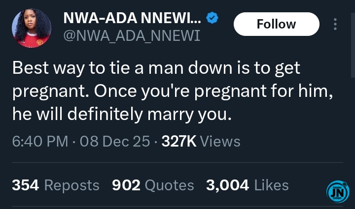 In her brief but explosive post, the lady insisted that pregnancy automatically pushes a man toward marriage, presenting it as a guaranteed strategy rather than a risky decision.