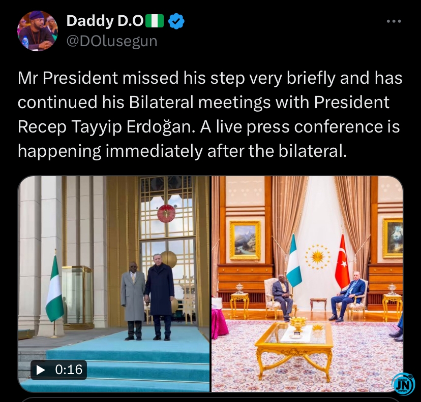 He wrote: “Mr President missed his step very briefly and has continued his Bilateral meetings with President Recep Tayyip Erdoğan. A live press conference is happening immediately after the bilateral.”
