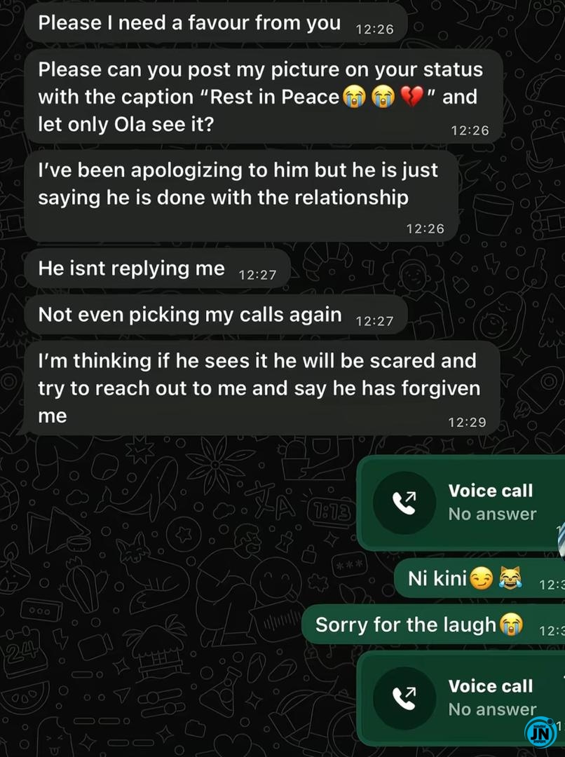 In a screenshot that quickly circulated on TikTok via @lohreyy, the woman was seen sending a WhatsApp message to her friend requesting that she post a picture on her status with the caption “Rest in Peace (RIP)”. She specified that the post should only be visible to her boyfriend, hoping that the dramatic gesture would prompt him to reconsider their relationship and reach out to her.
