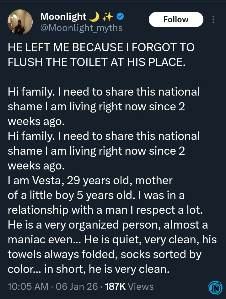 “HE LEFT ME BECAUSE I FORGOT TO FLUSH THE TOILET AT HIS PLACE. Hi family. I need to share this national shame I am living right now since 2 weeks ago.”