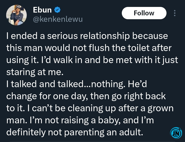 According to her, the breakup came after she forgot to flush once, an action her partner could not overlook.