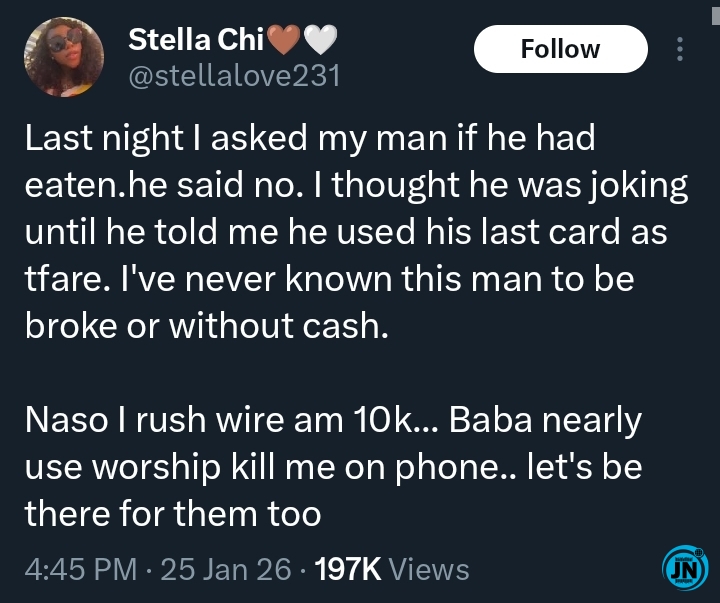 According to her story, the incident happened late at night when she casually asked her man if he had eaten. At first, she thought he was joking when he replied no, but the situation became serious after he explained that he had spent his last money on transportation fare and had nothing left to buy food.