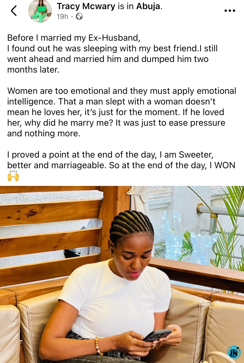 “Before I married my Ex-Husband, I found out he was sleeping with my best friend. I still went ahead and married him and dumped him two months later. Women are too emotional and they must apply emotional intelligence. That a man slept with a woman doesn’t mean he loves her, it’s just for the moment. If he loved her, why did he marry me? It was just to ease pressure and nothing more. I proved a point at the end of the day, I am sweeter, better, and marriageable. So at the end of the day, I WON.”