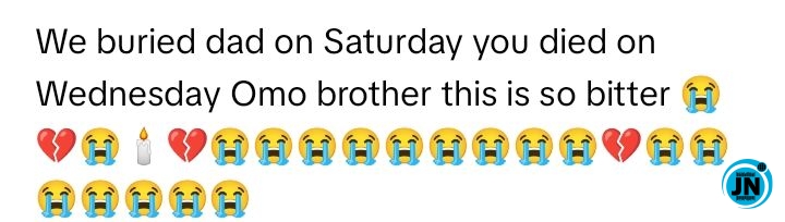 In her TikTok post, the lady described the death of her brother as a particularly bitter experience, expressing her anguish and disbelief with crying emojis. Her message read: “We buried dad on Saturday you died on Wednesday Omo brother this is so bitter. Brother come back ooooo.” The post illustrates the intensity of her grief and the shock of experiencing two significant losses in such a short time frame.