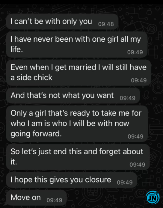 In the screenshots, the man admitted that he could not commit exclusively to one woman, revealing that infidelity has been a consistent pattern in his life. He wrote: “I can’t be with only you. I have never been with one girl all my life. Even when I get married I will still have a side chick. And that’s not what you want. Only a girl that’s ready to take me for who I am is who I will be with now going forward.”
