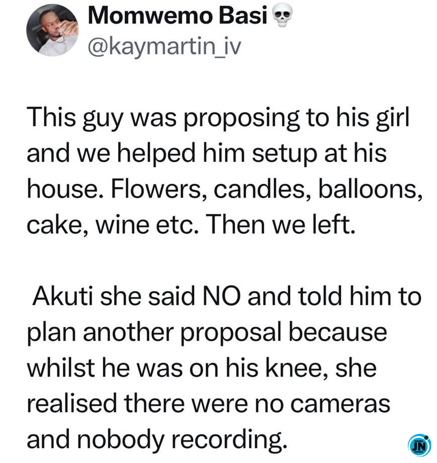 The post by @kaymartin_iv explained the incident in detail: “This guy was proposing to his girl and we helped him set up at his house. Flowers, candles, balloons, cake, wine etc. Then we left. Akuti she said NO and told him to plan another proposal because whilst he was on his knee, she realised there were no cameras and nobody recording.”