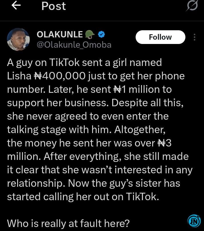 Altogether, the money he sent her was over ₦3 million. After everything, she still made it clear that she wasn’t interested in any relationship. Now the guy’s sister has started calling her out on TikTok. Who is really at fault here?.