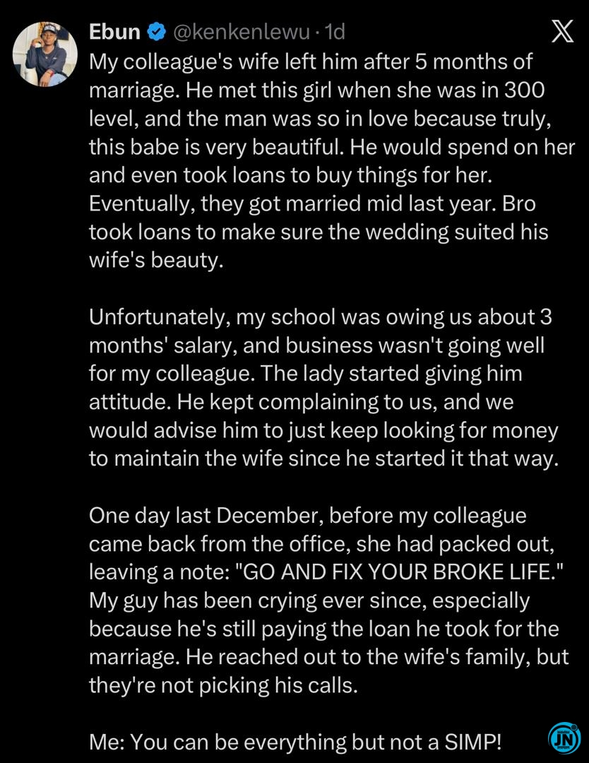 In a viral tweet shared on X (formerly Twitter) by his colleague, Ebun, it was revealed that the man had met his wife while she was in 300 level at university. From the beginning, he was deeply infatuated with her, particularly drawn to her beauty, charm, and presence. His affection for her was evident in the way he went to great lengths to provide for her and ensure her happiness, sparing no expense in indulging her lifestyle.