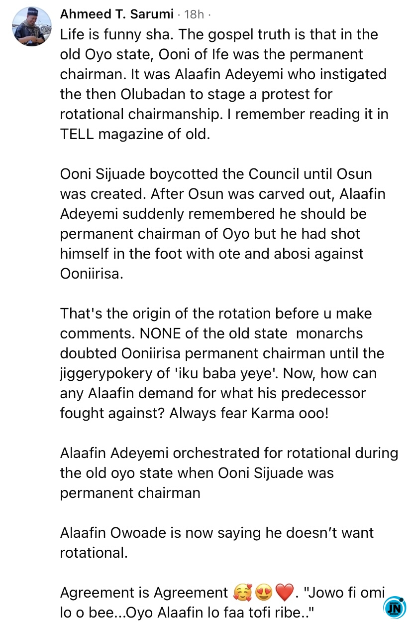 “That’s the origin of the rotation before u make comments. NONE of the old state monarchs doubted Ooniirisa permanent chairman until the jiggerypokery of ‘iku baba yeye’. Now, how can any Alaafin demand for what his predecessor fought against? Always fear Karma ooo!