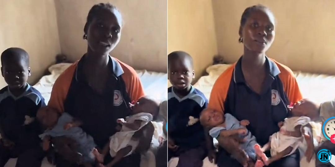 In a video shared online, the mother spoke in Yoruba, confirming that her husband abandoned her shortly after she delivered the twins. She expressed the challenges of trying to care for five children on her own, detailing how difficult it has been to provide food and basic care for the newborns and her other children. Her frail appearance and emotional account in the video have stirred strong reactions among viewers, many of whom have expressed sympathy and urged immediate help.