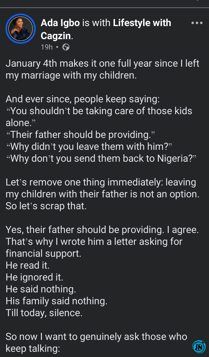The post has since garnered significant attention, with many social media users expressing empathy for Ada Igbo’s situation, praising her resilience, and offering advice or support. Others have used the post as a platform to discuss broader issues surrounding single parenting, marital breakdowns, and the responsibilities of estranged spouses in the care of children.