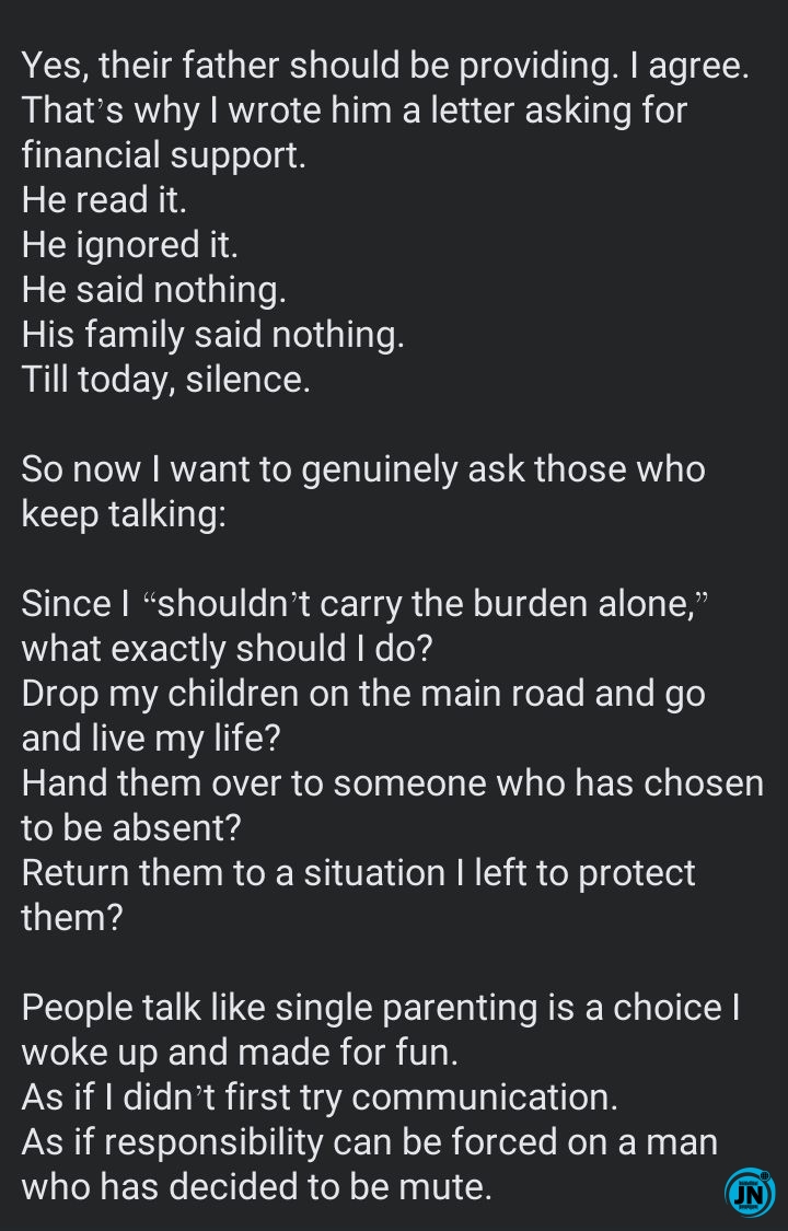 She expressed frustration over the perception that single parenting is voluntary, explaining that she exhausted all avenues of communication before taking on the responsibility alone. “People talk like single parenting is a choice I woke up and made for fun. As if I didn’t first try communication. As if responsibility can be forced on a man who has decided to be mute,” she wrote.
