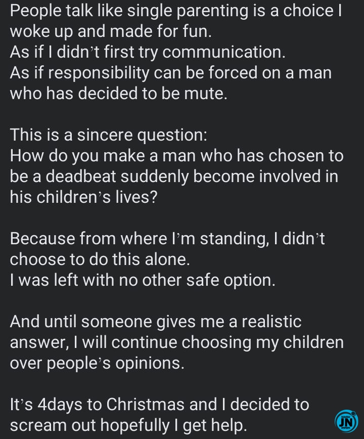 She also noted the timing of her post, sharing her frustration just days before Christmas. “It’s 4 days to Christmas and I decided to scream out hopefully I get help,” she concluded, appealing to social media users for understanding and support.