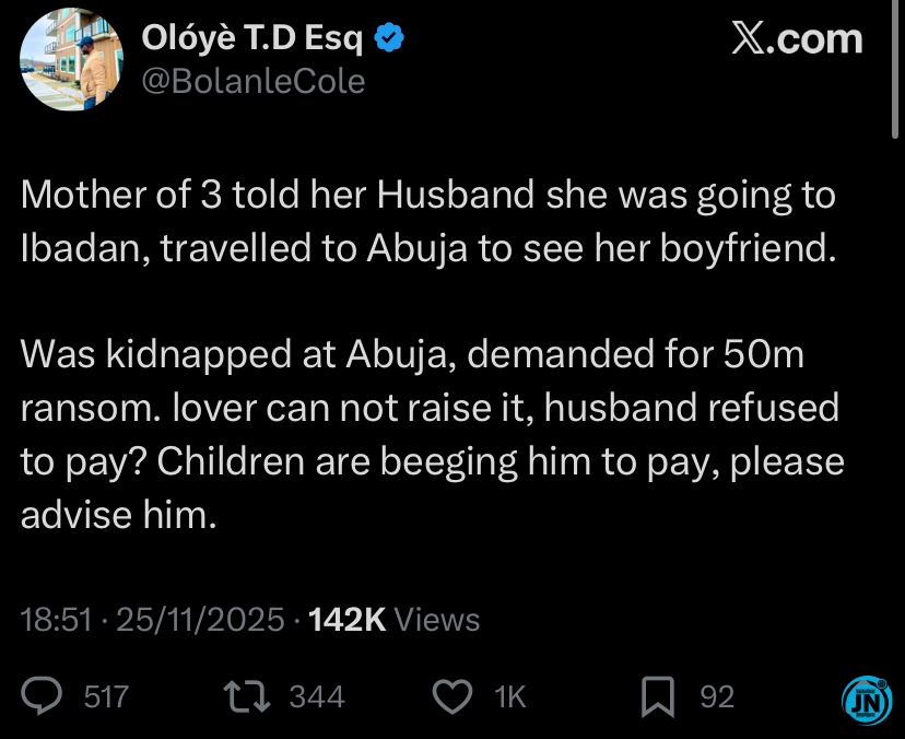 The post read: “Mother of 3 told her husband she was going to Ibadan, travelled to Abuja to see her boyfriend. Was kidnapped at Abuja, demanded for 50m ransom. Lover cannot raise it, husband refused to pay. Children are begging him to pay, please advise him.”