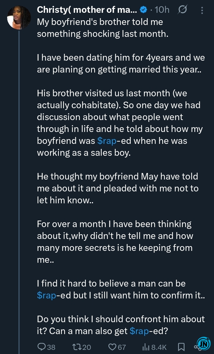 She said the brother told her that her boyfriend was allegedly raped while working as a sales boy years ago. He reportedly assumed she already knew about the incident and, after realising she did not, begged her not to tell her boyfriend that the topic had come up, stressing that it was not his place to share the information.
