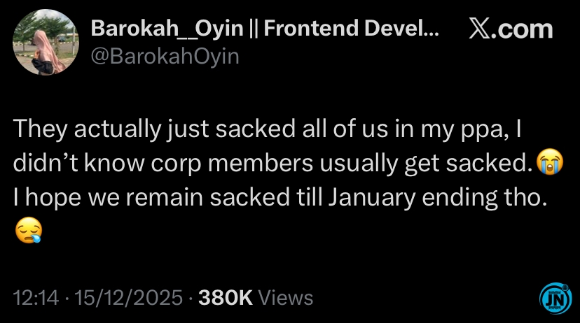 The affected corps member, identified on X as @barokahoyin, recounted the incident in detail, describing the moment she discovered that she and other corps members had been sacked. She revealed that the sudden termination came without notice, and no official reasoning was given to the corps members, leaving everyone in a state of confusion and disappointment. She emphasized her surprise, noting that she had never known that corps members could be dismissed from their PPA while serving in the NYSC scheme.