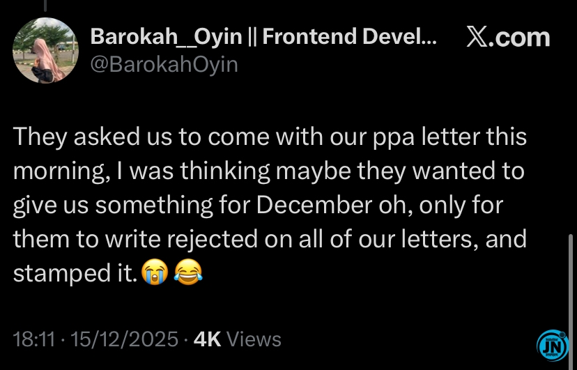 According to @barokahoyin, the day began as any other, with corps members asked to report to the office carrying their PPA letters. Initially, she assumed that the gathering might have been for a positive announcement, possibly related to end-of-year gestures or allowances provided by the organization. However, to her shock, all corps members present were handed back their PPA letters marked “rejected” and stamped accordingly, signifying that they were no longer required to continue in their assignments. The abrupt nature of the dismissal left the corps members stunned, with no guidance or alternatives offered by the PPA authorities at the time.