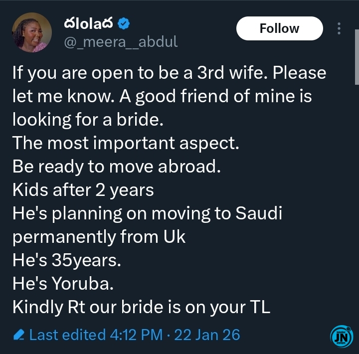 The unusual request, which was shared on X, formerly known as Twitter, quickly caught the attention of thousands of users, sparking discussions around polygamy, marriage expectations, relocation, and modern relationship dynamics.