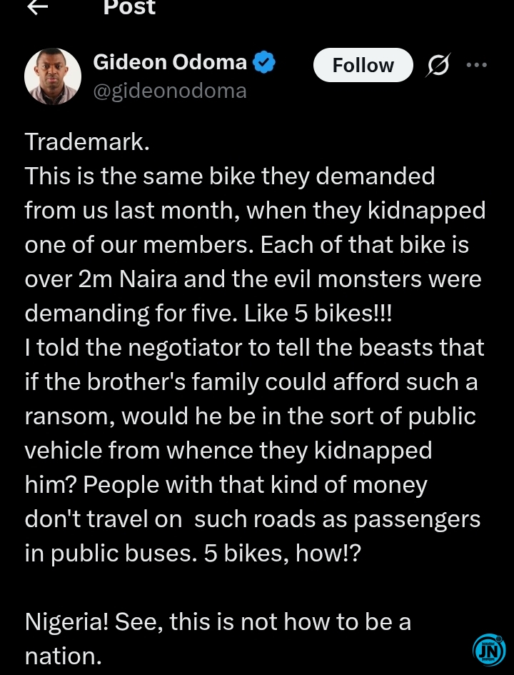 “This is the same bike they demanded from us last month, when they kidnapped one of our members. Each of that bike is over 2m Naira and the evil monsters were demanding five. Like 5 bikes! I told the negotiator to tell the beasts that if the brother’s family could afford such a ransom, would he be in the sort of public vehicle from whence they kidnapped him? People with that kind of money don’t travel on such roads as passengers in public buses. 5 bikes, how? Nigeria! See, this is not how to be a nation.”