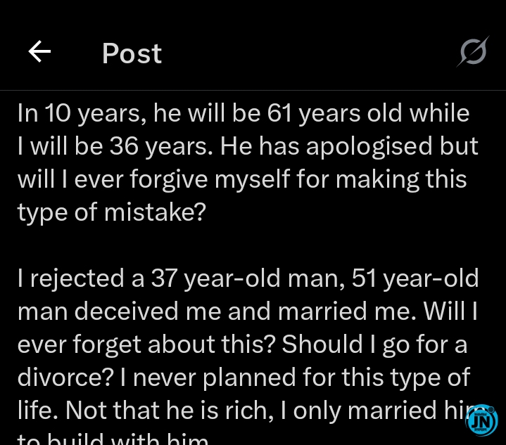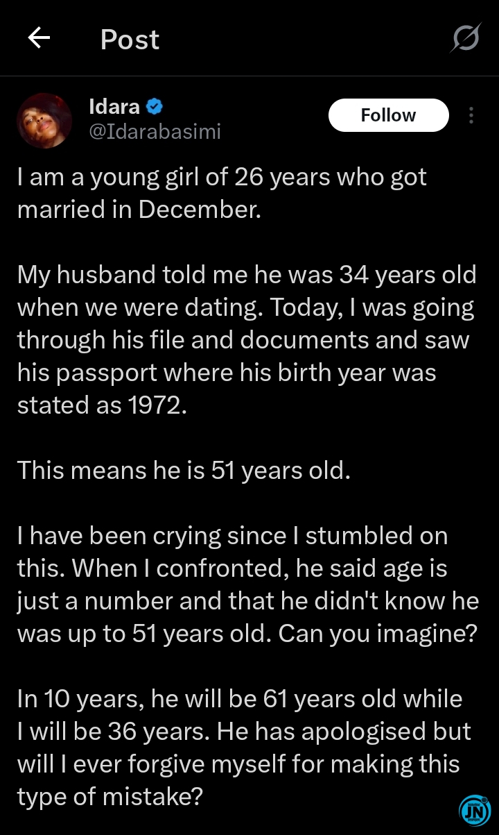 A 26-year-old lady has been left devastated after uncovering shocking details about her husband’s real age, just weeks after their wedding.