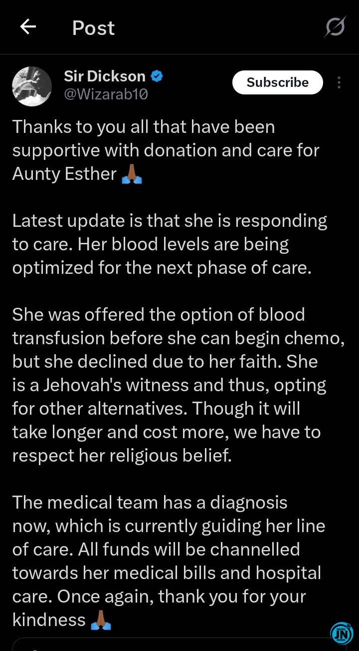 The update was shared by popular X influencer, Sir Dickson, who organized and coordinated the donation campaign after the woman appealed for financial assistance to fund her medical care. According to him, despite the massive outpouring of generosity from Nigerians, the patient—known on X as @auntieesther pepper girl—has chosen to follow a treatment path aligned with her faith.