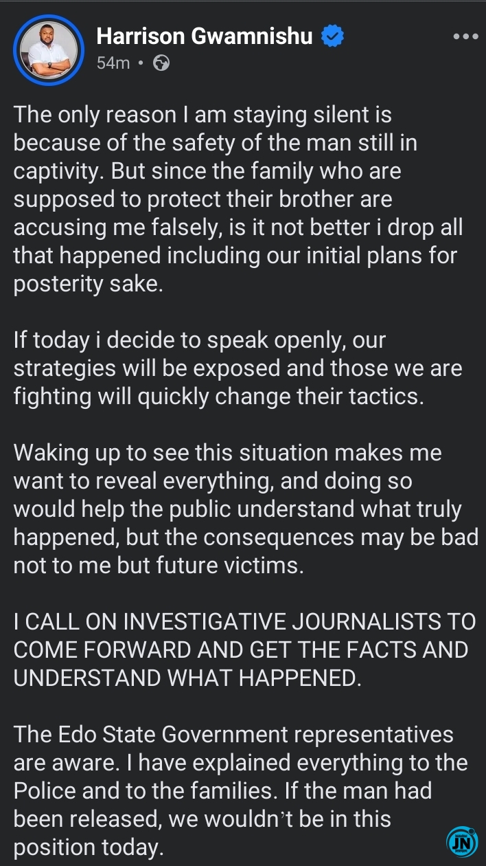 “The only reason I am staying silent is because of the safety of the man still in captivity. But since the family who are supposed to protect their brother are accusing me falsely, is it not better i drop all that happened including our initial plans for posterity sake”, He stated in the post.