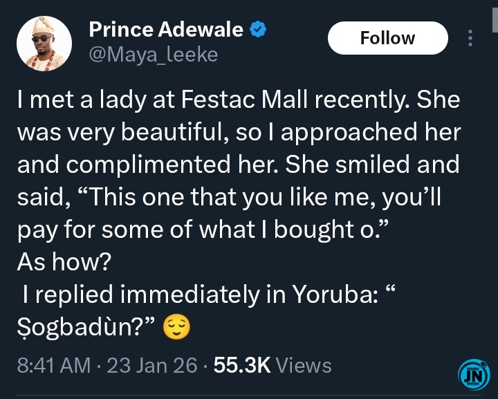 He wrote: “I met a lady at Festac Mall recently. She was very beautiful, so I approached her and complimented her. She smiled and said, ‘This one that you like me, you’ll pay for some of what I bought o.’”